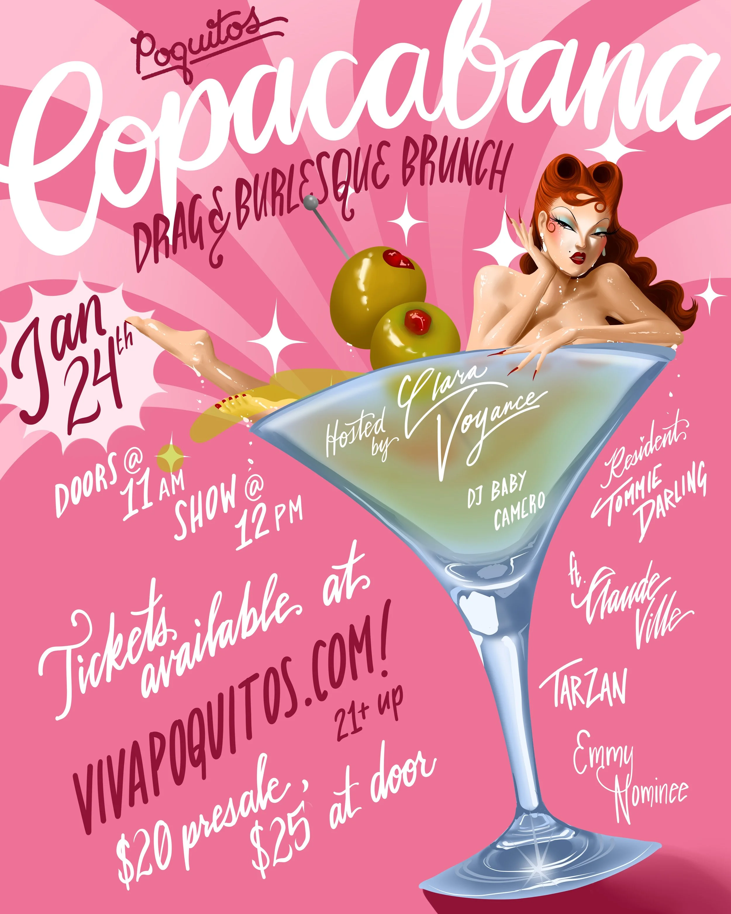 12pm to 2pmJoin us at Poquitos on Saturday, February 21st for an afternoon of unapologetic glamour hosted by the incomparable Clara Voyance, alongside our resident diva Tommie Darling and show-stopping performances by Porcelain, Vima Venom, and Dante Vanity.